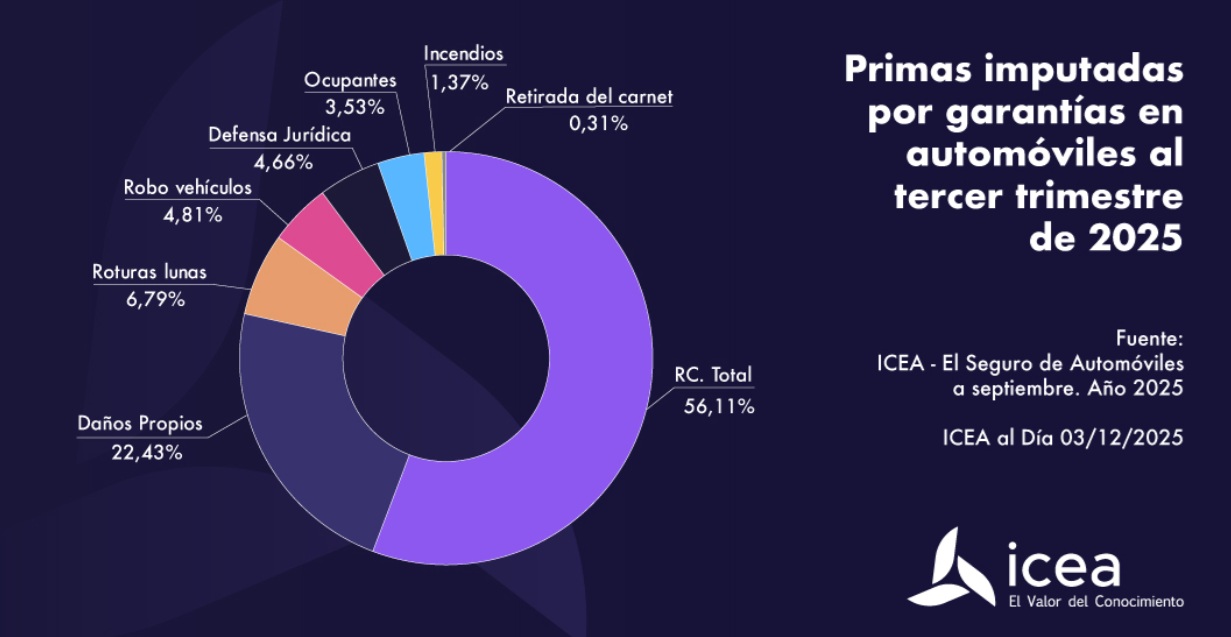 En el tercer trimestre del año, y según datos de ICEA, las garantías de RC y Daños suponen juntas el 78,53% de las primas. Solo RC supuso el 56,11% de las primas imputadas para el conjunto de vehículos mientras que Daños propios fue la siguiente garantía para el conjunto de vehículos, con el 22,43% de las primas.