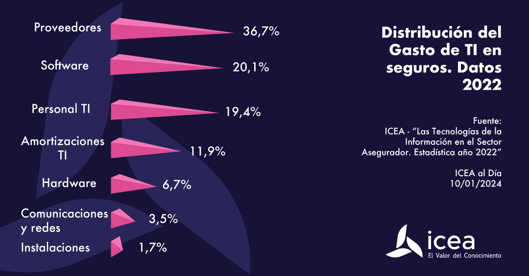 ICEA ha publicado en su boletín semanal cómo se distribuye el gasto en TI de las aseguradoras. Son datos de 2022, pero sirven para hacerse una idea de la tendencia. Los servicios ofrecidos por los proveedores externos representan la partida más importante, acaparando el 36,7% del gasto total en TI, lo que supone 0,6 puntos más que en 2021.