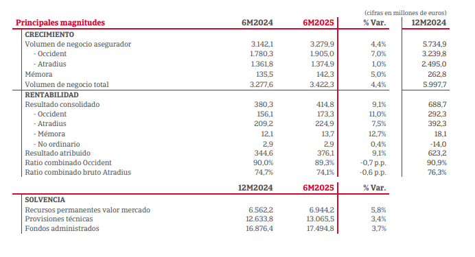 Al cierre del primer semestre de 2025, GCO ha obtenido un resultado consolidado de 414,8 millones de euros, lo que supone un incremento del 9,1%. A este resultado, Occident ha contribuido con 173,3 millones (+11%); Atradius -negocio de Crédito y Caución-, con 224,9 millones (+7,5%); y la funeraria Mémora, con 13,7 millones (+12,7%). Por su parte, el resultado atribuido se ha incrementado también un 9,1%, alcanzando los 376,1 millones,