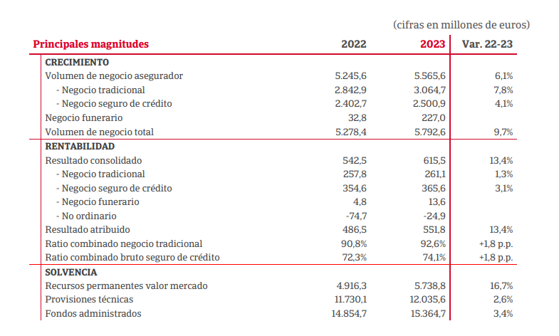 La otra parte del negocio del grupo, el negocio de Crédito a través de Atradius Crédito y Caución, aportó al beneficio 365,6 millones, un 3,1% más que un año antes. El volumen de negocio -primas facturadas e ingresos por información- se situó en los 2.500,9 millones superando en un 4,1% los datos de 2022. Por su parte, el ratio combinado bruto de reaseguró cerró el ejercicio en el 74,1% después de incrementarse en 1,8 pp. Destaca el grupo que el negocio de Crédito "continúa normalizándose, aunque con una entrada de siniestros algo por debajo del período prepandemia". También resalta que han mantenido la "selección exhaustiva de los riesgos y un provisionamiento prudente".