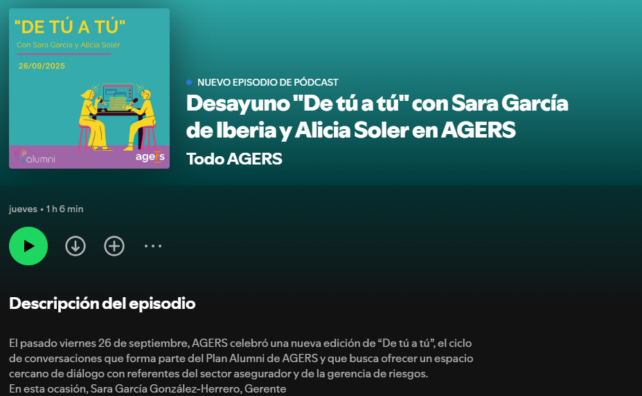 Agers ha celebrado una nueva edición de 'De tú a tú', el ciclo de conversaciones que forma parte del Plan Alumni de Agers y que busca ofrecer un espacio de diálogo con referentes del sector asegurador y de la gerencia de riesgos. En esta ocasión, Alicia Soler, directora de la asociación, ha conversado con Sara García González-Herrero, gerente de Riesgos en Iberia, que ha hablado de su trayectoria y también de la importancia de la cercanía, la comunicación y el acompañamiento real como elementos esenciales en la gestión de riesgos. También, ha destacado el valor que aportan las nuevas generaciones, la relevancia de los riesgos emergentes y la responsabilidad del sector en la transformación sostenible. Esta conversación está disponible en Spotify y YouTube.