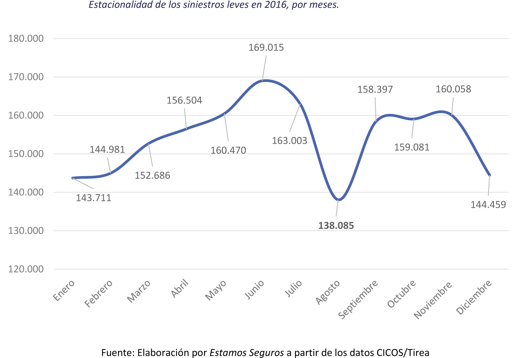 Los accidentes leves también varían en función de la época del año y los días de la semana. Los periodos vacacionales presentan menos siniestros. Esto se debe a que los golpes de chapa suelen ser resultado del tráfico urbano y este se hace menos denso en los momentos de descanso, según comenta Unespa. Agosto fue el mes más tranquilo del año, con sólo 138.085 colisiones leves. Le siguen los meses navideños: enero (143.711) y diciembre (144.459). El momento más problemático del año es junio, con 169.015 choques sin heridos entre vehículos.