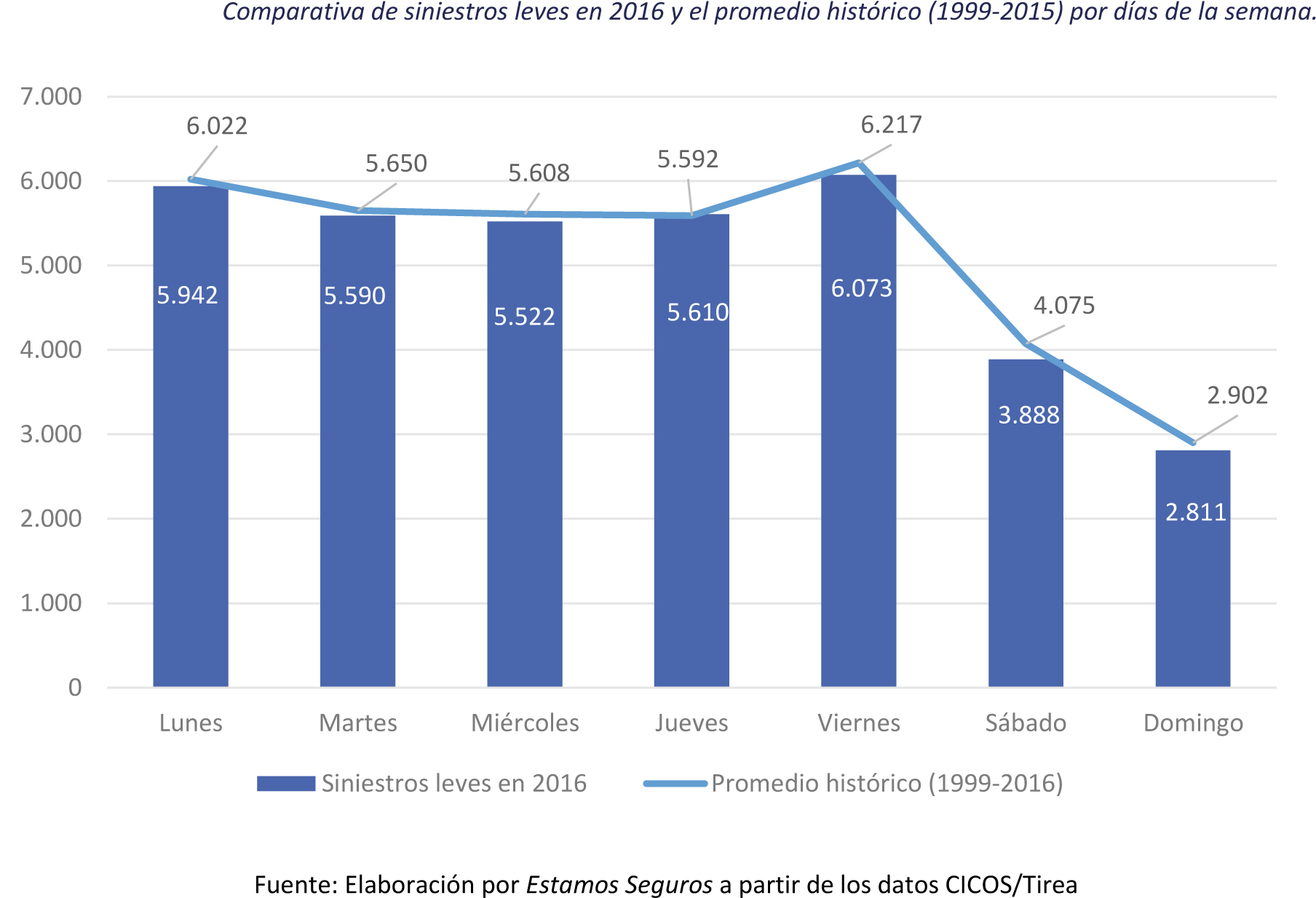 La estacionalidad por días de la semana también refleja los comportamientos colectivos de la gente. El viernes es la jornada con más golpes de chapa en las ciudades. De media, se produjeron 6.073 siniestros en 2016. Le sigue el lunes, con 5.942 golpes. Las colisiones descienden el fin de semana, hasta tocar un mínimo de 2.811 de media cada domingo.
