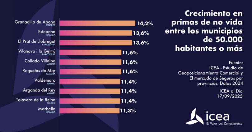 Si nos fijamos en los municipios de menos de 50.000 habitantes, los 3 con mayor crecimiento de primas No Vida resultaron ser Granadilla de Abona, en Tenerife, Estepona, en Málaga, y El Prat de Llobregat, en Barcelona, con crecimientos superiores al 13,5%. Destaca el análisis que de estos municipios, la mayoría experimentó crecimientos de población y de renta superiores a la media, pero también destacaron por una mayor productividad de sus mediadores, resalta.