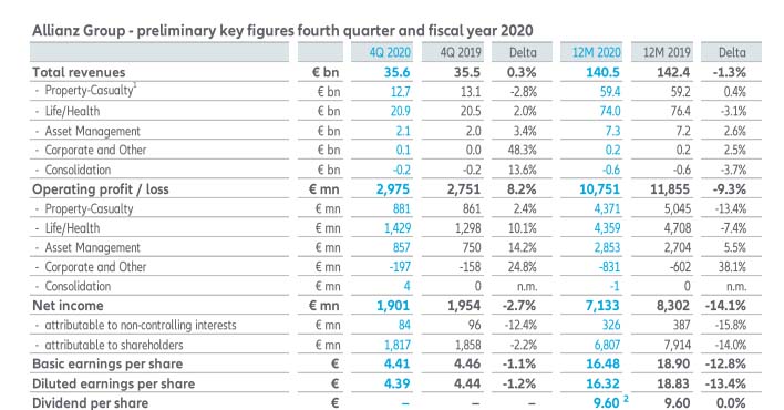 Grupo Allianz cerró el ejercicio 2020 con un beneficio neto de 8.302 millones de euros, lo que significa una caída del 14,1% en relación al ejercicio anterior, mientras que sus ingresos totales descendieron un 1,3%, hasta los 140.000 millones de euros arrastrados por el negocio de Vida y Salud (-3,1%). La pandemia también ha dejado su huella en los resultados del gigante asegurador alemán. Según sus estimaciones, el Covid-19 ha tenido un impacto en el grupo de 1.300 millones. El ROE se ha situado en el 11,4% y el margen de solvencia en el 207% (en 2019 estaba en el 212%).