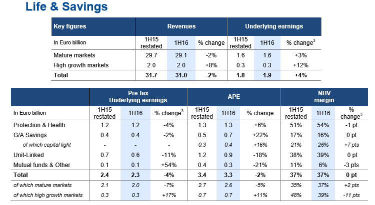 Los ingresos alcanzaron los 54.036 millones (-0,5%) con mejoras en primas No Vida (4%) y caída del 2% en Vida, con un volumen de 18.600 millones y 31.000 millones, respectivamente. La gestión de activos retrocedió un 8% hasta los 1.799 millones. La entidad recibió buenos datos de AXA Corporate Solutions con ingresos que aumentaron un 5% y de AXA Assistance que mejoraron un 8%.