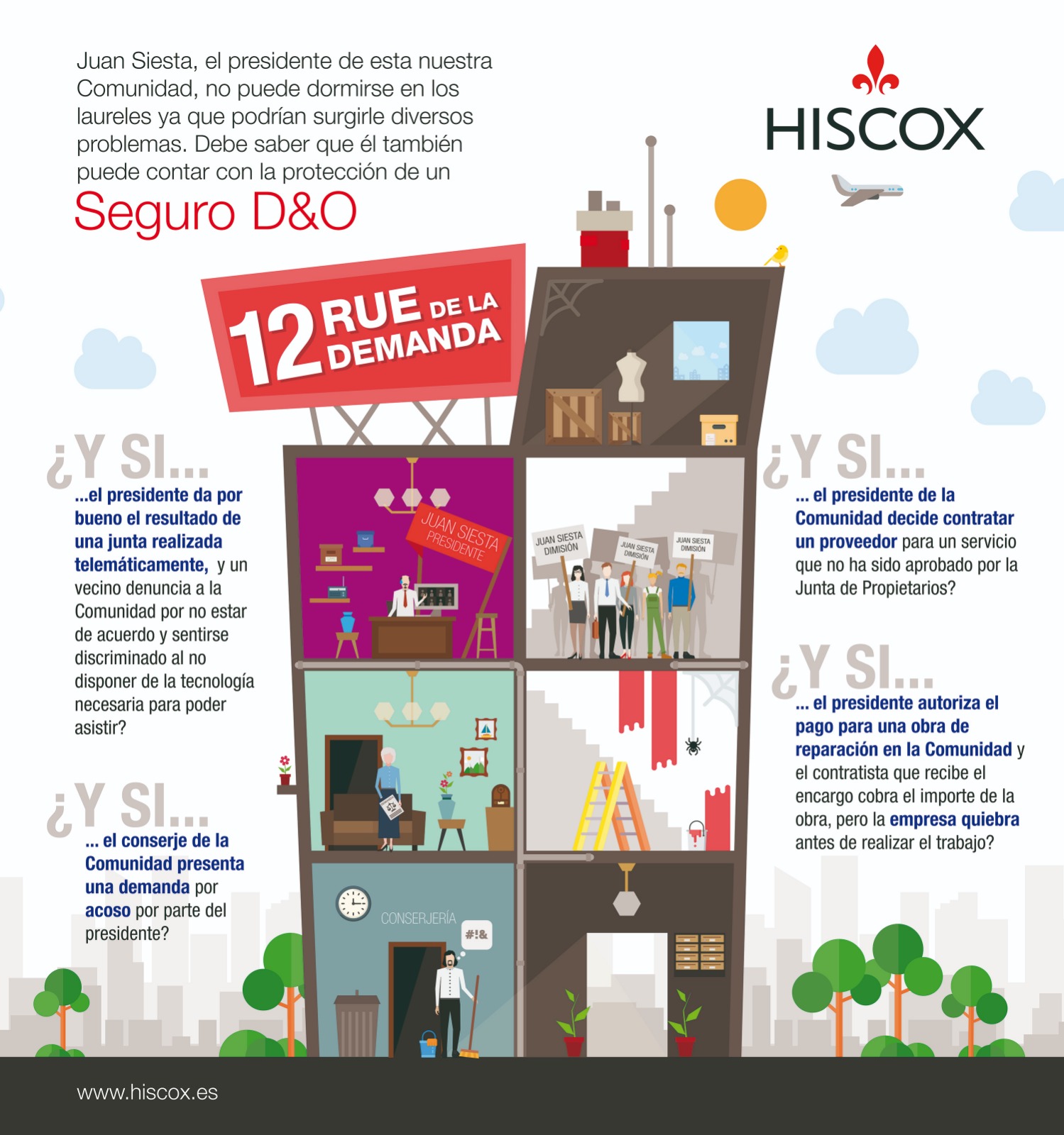 La compañía trata de concienciar sobre esta situación publicando una infografía que analiza los principales riesgos a los que se enfrentan las comunidades de propietarios que en el caso de recibir una denuncia por parte de un vecino o proveedor podría poner en peligro el patrimonio de la comunidad, "un riesgo aún mayor si cabe en el caso de que toda la junta de gobierno sea dirigida por personas que forman parte de la propia comunidad, en la mayoría de los casos asumidos por obligación legal y cuyos mandatos debido a la pandemia en ocasiones se está alargando más del año habitual", apunta Nerea de la Fuente, directora de Suscripción Técnica de Hiscox Iberia.