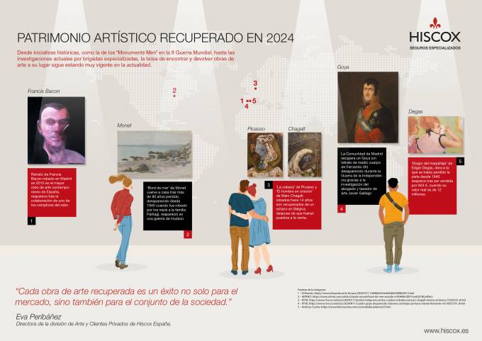 Como cada año, Hiscox ha hecho una recopilación de algunas de las obras de arte que, tras ser robadas o desaparecidas a lo largo del tiempo, han sido recuperadas en 2024. "Cada obra de arte recuperada es un éxito no solo para el mercado, sino también para el conjunto de la sociedad. Y es que cada pieza rescatada permite reconstruir nuestra propia historia, así como valorar realmente la riqueza cultural que hemos heredado. Por esta razón, el seguro también está detrás de este proceso, facilitándolo y siendo también un factor que protege la preservación de este legado cultural", ha resaltado Eva Peribáñez, directora de la división de Arte y Clientes Privados de Hiscox España.