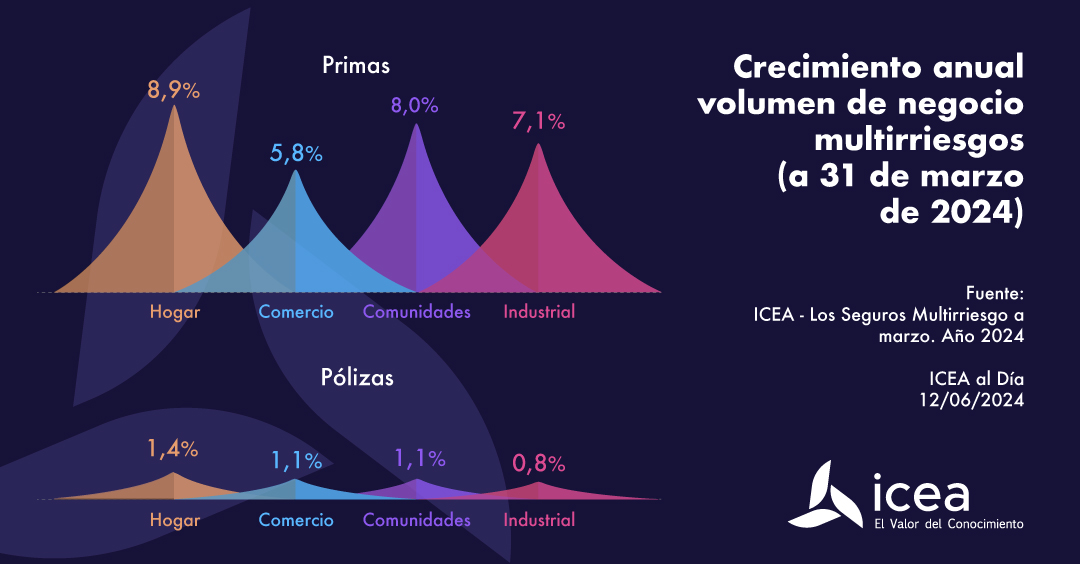 Los seguros que se engloban en Multirriesgos facturaron hasta marzo de 2024 un volumen de primas de 2.596 millones de euros, lo que supuso un incremento anual del 8,2%. Según sus modalidades, Hogar (+8,9%) y Comunidades (+8%) son las que más contribuido aunque también han mantenido un comportamiento positivo Industria (+7,1%) y Comercio (+5,8%).