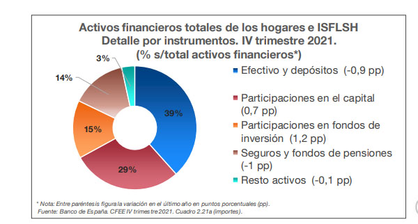 Si analizamos estos activos por sus diversos componentes encontramos que la preferencia de los hogares se mantuvo en efectivo y depósitos (38% del total), seguido de participaciones en capital (29%), participaciones en fondos de inversión (15%) y seguros y fondos de pensiones (14%).