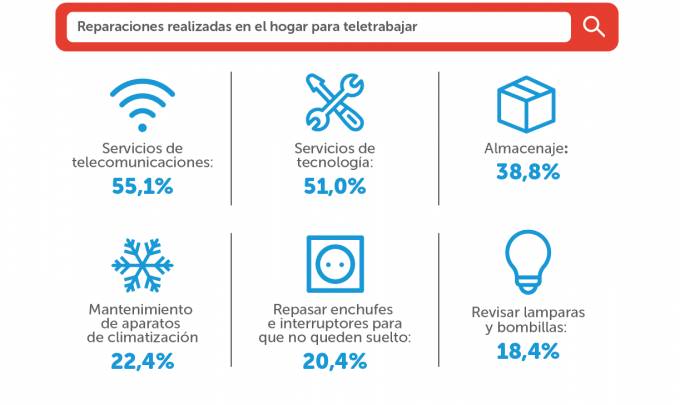 Pero el teletrabajo, al menos el actual a consecuencia de la pandemia, también tiene sus desventajas. Un 54% se queja de que en casa no cuenta con las instalaciones necesarias y la mitad lamenta que el trabajador tiene que asumir el coste de la conexión a internet y el gasto energético. También, reconocen que tienen que afrontar, con una mayor frecuencia que antes, reparaciones relacionadas con la electricidad, la climatización y los electrodomésticos.