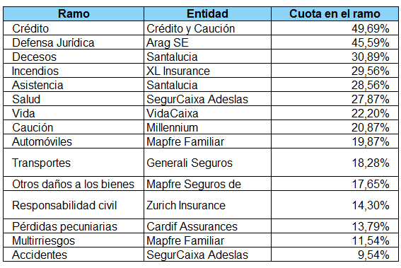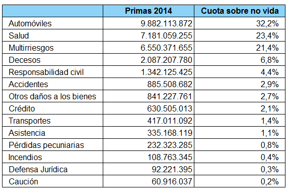 ICEA ha publicado los rankings definitivos del año 2014, con los grupos y entidades líderes en cada ramo en volumen de primas. Además, la asociación ha dado a conocer los volúmenes de primas por ramos y modalidades en 2014 en No Vida. Automóviles alcanzó los 9.882 millones de euros (un 32,2% del total de las primas de No Vida), seguido de los ramos de Salud (23,4% de las primas), Multirriesgos (21,4%) y Decesos (6,8%).