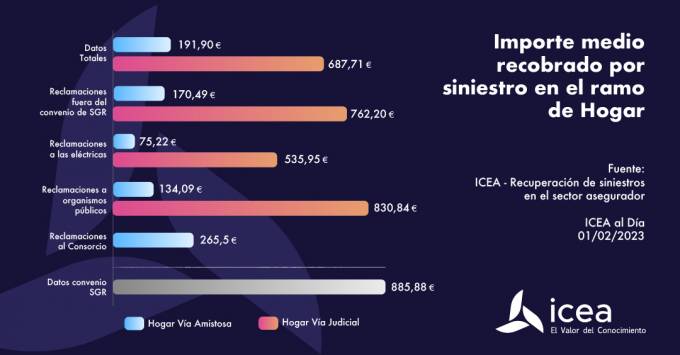 En el ramo de Multirriesgo Hogar, las cuantías más elevadas se dan siempre en las reclamaciones por vía judicial. Así, el importe medio recobrado por vía amistosa se sitúa en los 191,90 euros mientras que asciende hasta los 687,71 euros si se acude a la justicia.