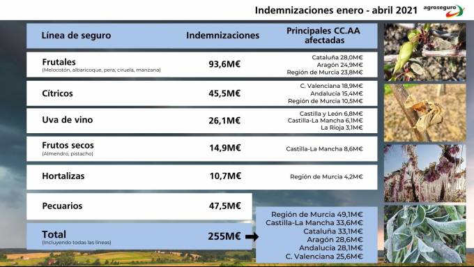 Las indemnizaciones al campo crecieron un 37% en el primer cuatrimestre del año hasta los 255 millones de euros según señala Agroseguro. La Región de Murcia ha sido la más afectada donde las indemnizaciones alcanzaron los 49 millones de euros, seguida por Castilla-La Mancha y Cataluña con 33 millones.