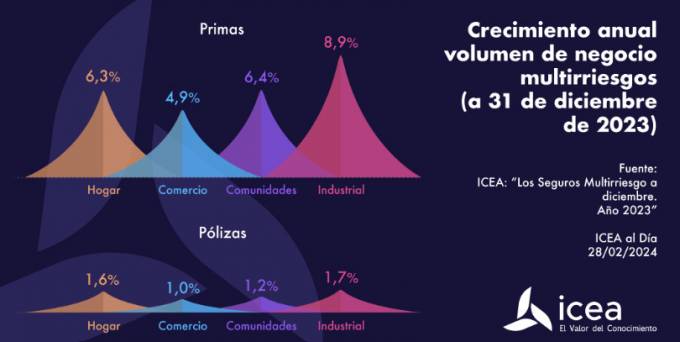 La modalidad de seguros Industrial mejoró sus primas un 8,9% durante el pasado año. Este negocio fue el que impulsó que Multirriesgos cerrara 2023 con un volumen total de primas de 9.158 millones, lo que muestra una mejora del 6,6% interanual. Además, Comunidades y Hogar registraron crecimientos de primas del 6,4% y del 6,3%, respectivamente, según los datos de ICEA.