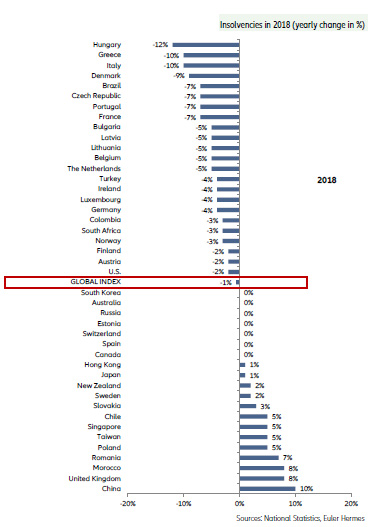 "En general, las insolvencias se están estabilizando en todo el mundo después de siete años de descensos. Esto confirma la vuelta del riesgo de crédito con la recuperación económica. En 2018, las empresas de Asia, Latinoamérica, Europa del Este y Reino Unido deberían ser seguidas de cerca. Además, las grandes insolvencias están aumentando rápidamente, ya que la disrupción en sectores como servicios y comercio minorista, no dejan a nadie indemne. Hay que estar atentos al efecto dominó", indica Ludovic Subran, economista jefe de Euler Hermes.