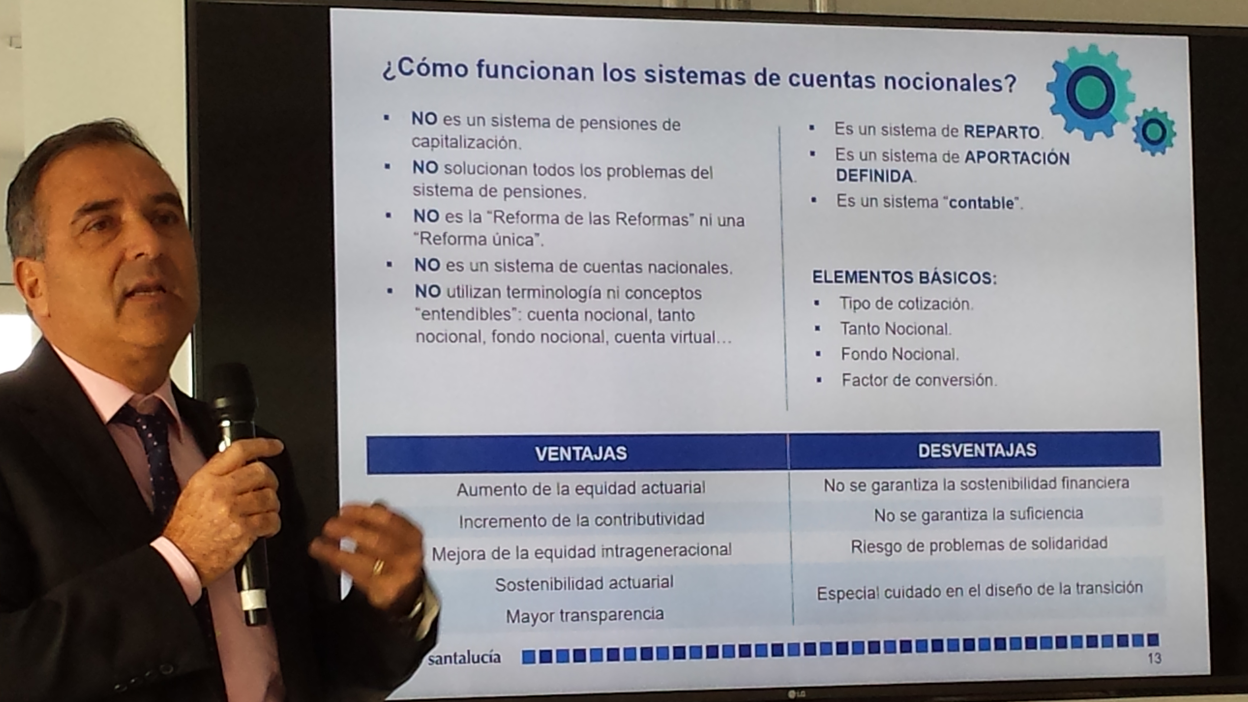 Andrés Romero, director general de santalucía, explicó durante la presentación, que, aunque España ha mantenido durante mucho tiempo uno de los sistemas más protectores en lo que a pensión de jubilación se refiere, es obvio que la situación va a cambiar en el futuro ya que el actual gasto en pensiones es "inasumible" por los estados. En este sentido, mostró su apoyo a un sistema de cuentas nocionales de contribución definida similar al que ya se utiliza en países de nuestro entorno como Suecia, Italia, Polonia o Letonia.