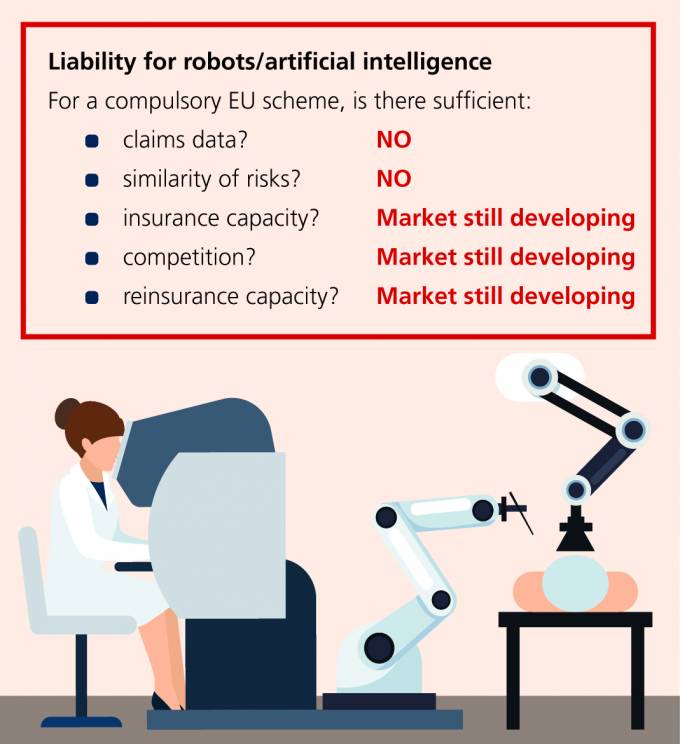 Insurance Europe ha publicado un documento de trabajo en el que explica cuándo un seguro obligatorio es eficaz y cuándo no. Entre otras cosas, la federación destaca que un seguro obligatorio para robots y la inteligencia artificial (IA) podría ser contraproducente: "Esto es debido a la falta de datos sobre los riesgos, a la no suficiente similitud entre los riesgos presentados por los diferentes tipos de robots e IA, y porque el mercado asegurador en este ámbito todavía se está desarrollando".
