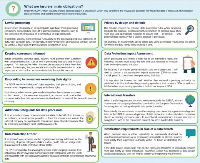 Insurance Europe ha publicado una descripción general de las principales obligaciones a las que las compañías de seguros tendrán que hacer frente para cumplir con el Reglamento General de Protección de Datos (RGPD) que se aplicará a partir de la próxima semana.