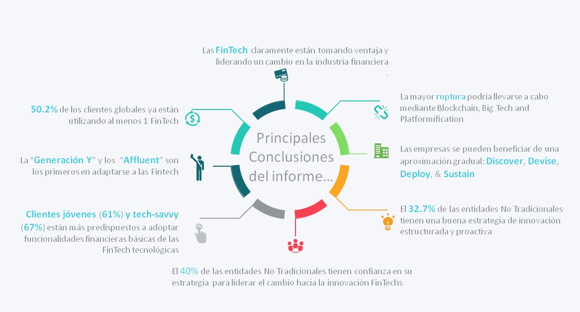 El informe revela que son los clientes más jóvenes, con altos conocimientos tecnológicos y alto poder adquisitivo los que más utilizan las empresas no tradicionales, colocándose a nivel mundial China e India como países en los que más se utilizan las fintechs. España se sitúa ya en 5ª posición en el ránking mundial con un 53,3% de penetración. De hecho, el crecimiento en nuestro país se sitúa en el 300% alcanzando ya las 238 fintech y 63 insurtech, compañías que crean 2.500 empleos nuevos y en las que se han invertido 250 millones de euros en 2016, según datos de AEFI.