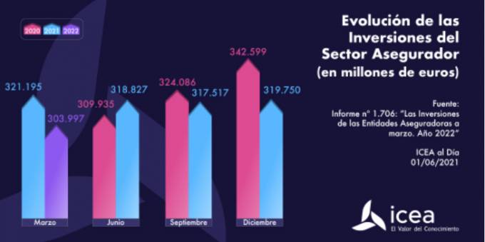 El volumen estimado del total de las inversiones del sector aseguradora español en el primer trimestre de este año se sitúa, según los datos de ICEA, en 303.997 millones de euros, una cantidad que es un 5,3% a los 321.195 que había al cierre de marzo de hace un año.