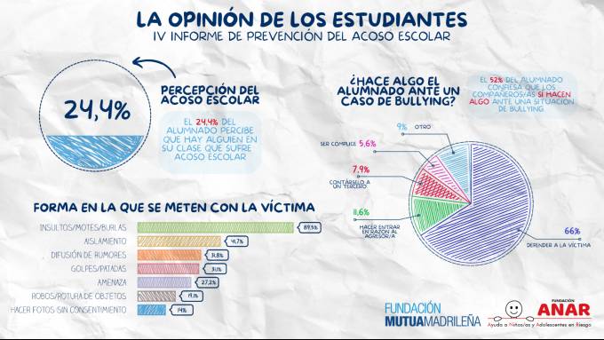 Fundación Mutua Madrileña y la Fundación ANAR han dado a conocer los resultados de su IV Informe sobre acoso escolar, un estudio anual que recoge la opinión de estudiantes (un total de 5.123) y docentes (229). Una de las principales conclusiones es que el acoso escolar sigue situándose por debajo de antes de la pandemia pero, con la vuelta completa a la presencialidad, ha crecido en el último curso.