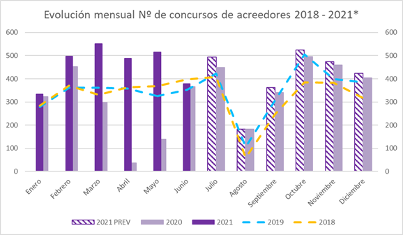 Partiendo de un escenario macroeconómico base, incluyendo la extensión de las políticas de apoyo fiscal hasta fin de año y la prórroga de la no obligatoriedad de presentar concurso nuevamente hasta 31 de diciembre 2021, Solunion prevé que las insolvencias empresariales se moderarán en el segundo semestre, cerrando 2021 con un crecimiento medio del 30%.