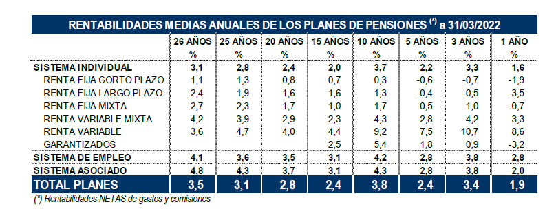 Con este escenario, la rentabilidad interanual de los Planes de Pensiones a finales de marzo se eleva al 1,9% gracias a las "notables rentabilidades obtenidas en 2021" y donde resaltan las rentabilidades de los Planes con mayor exposición a acciones (8,6%).