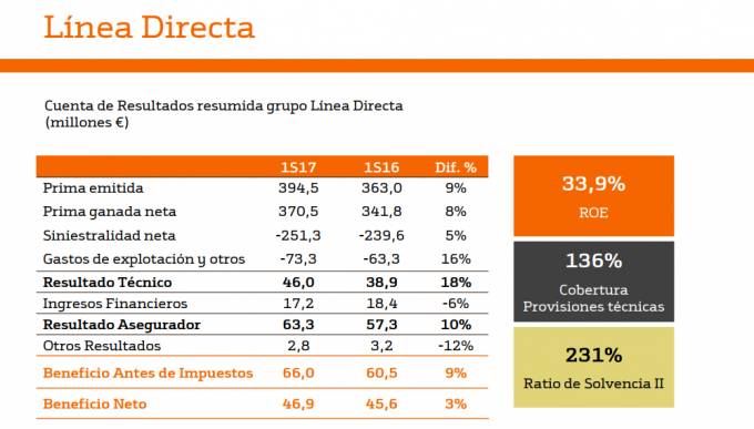Según los resultados de la entidad financiera presentados esta mañana, el ROE se ha situado en esta primera parte del año en el 33,9% y el ratio combinado alcanza el 89,2%. El beneficio neto de Línea Directa mejoró en un 3% los datos del pasado año hasta los 46,9 millones de euros con una siniestralidad neta que se incrementó en un 5%.