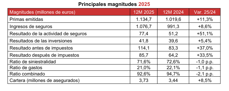 Por su parte, la siniestralidad se encuentra al cierre de diciembre en el 71,6% con una mejora de 1 punto en relación a 2024. Los gastos se han contraído en 1,1 puntos hasta situarse en el 21%.