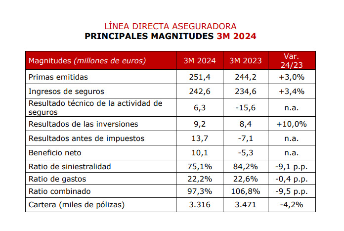Línea Directa presenta los resultados del primer trimestre del año como una "vuelta a la rentabilidad". La entidad de directo ha logrado al cierre de marzo un volumen de primas de 251,4 millones de euros, un 3% más, y creciendo en todas sus líneas de negocio: Autos, Hogar y Salud. Asimismo, la entidad ha logrado un beneficio de 10,1 millones de euros, mucho mejor que las pérdidas del pasado mes de marzo cuando notificó unas pérdidas de 5,3 millones.