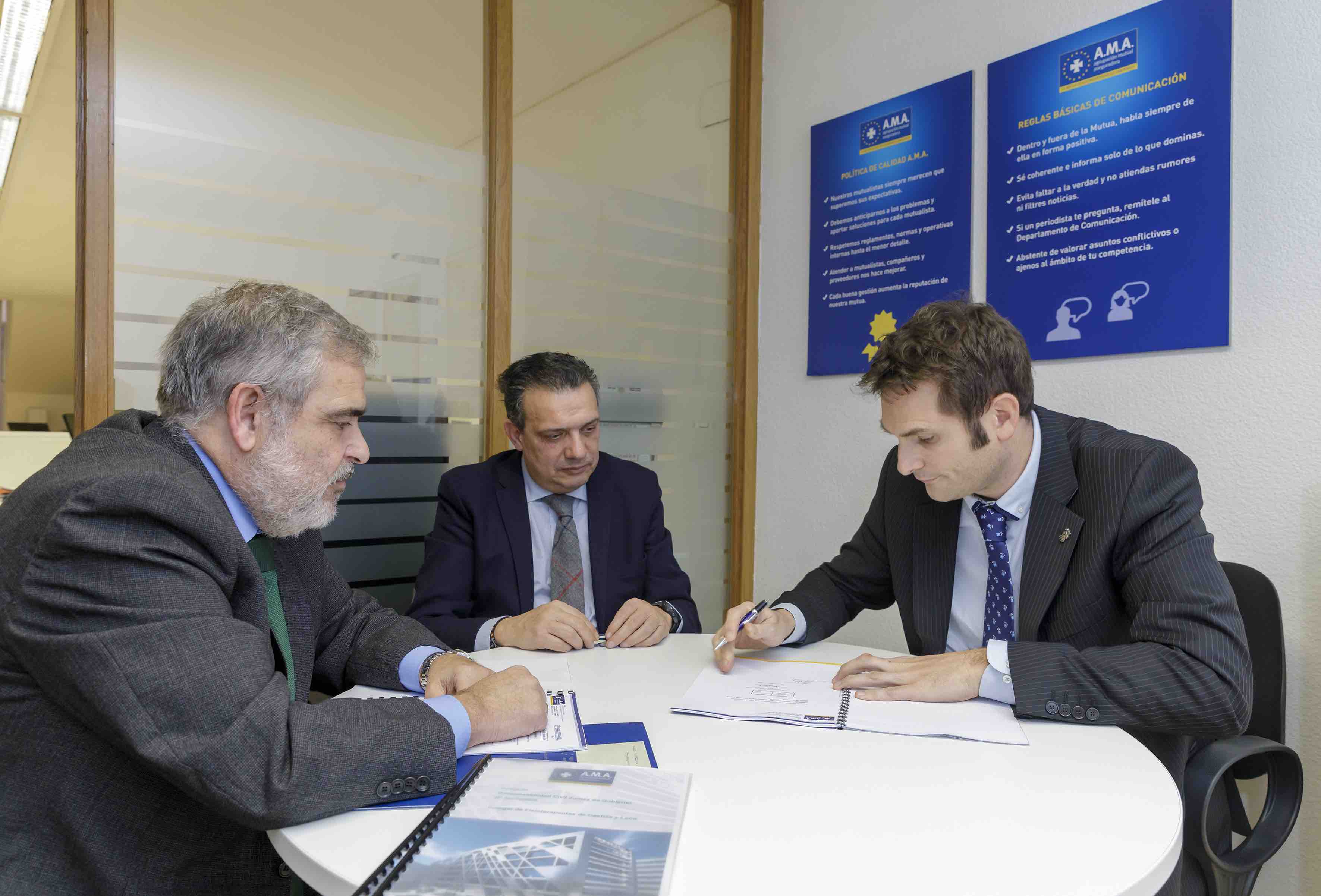 La firma del acuerdo fue ratificada por el presidente del Colegio, José Luis Morencia, en presencia del responsable de Colectivos de A.M.A.,Miguel Ángel Vázquez, y del director Territorial de A.M.A. en la zona, Jesús García Molpeceres.