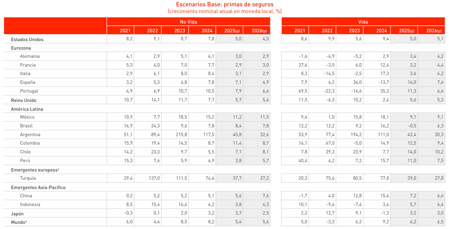Estas previsiones mejoran a las que hace la entidad para el conjunto del sector asegurador mundial: en No Vida avances del 5,4% para este año y del 5,6% para el siguiente. Mientras tanto, calcula para el negocio de Vida un repunte del 6,2% para el cierre de diciembre y 3 décimas más para en diciembre de 2026.