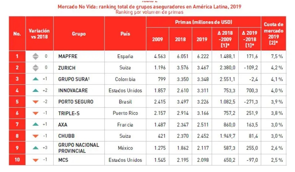 Mapfre continúa como la aseguradora líder del negocio No Vida en América Latina con un volumen total de primas de 8.729 millones de dólares y una cuota de mercado del 7,5% en este segmento, tres décimas más que el año previo y más de tres puntos porcentuales que la del segundo participante del ranking (Zurich, con el 4,2%). De hecho, el grupo sí experimentó un crecimiento de primas No Vida en la región, del 2,82%, hasta los 6.222 millones de dólares, que le ha valido a ampliar su liderazgo.