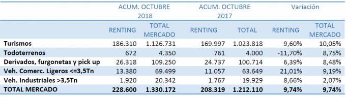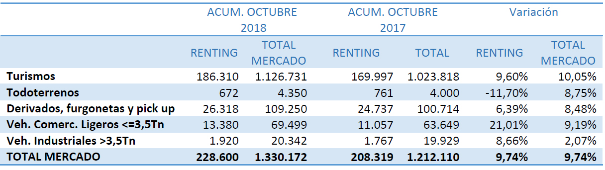 Hasta octubre de 2018, se han registrado 228.600 matriculaciones de vehículos de renting, lo que supone un crecimiento del 9,74% respecto al mismo periodo de 2017, según datos publicados por la Asociación Española de Renting de Vehículos (AER). En octubre, el renting contabilizó 18.645 unidades, un 1,72% más que hace un año, y el peso del renting en el total de las matriculaciones se mantiene en el 17,19%.