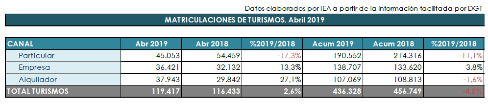 En abril, según datos facilitados por Anfac, las matriculaciones de turismos y todoterrenos han crecido un 2,6% respecto del mismo periodo del ejercicio anterior, ascendiendo a 119.417 unidades. Por canales, particulares ha caído un 17,3%, empresas ha aumentado un 13,3% y alquiladores ha crecido un 27,1%. Por el contrario, si se analiza el acumulado de matriculaciones en lo que va de año, se han registrado 436.328, un 4,5% menos que en 2018.