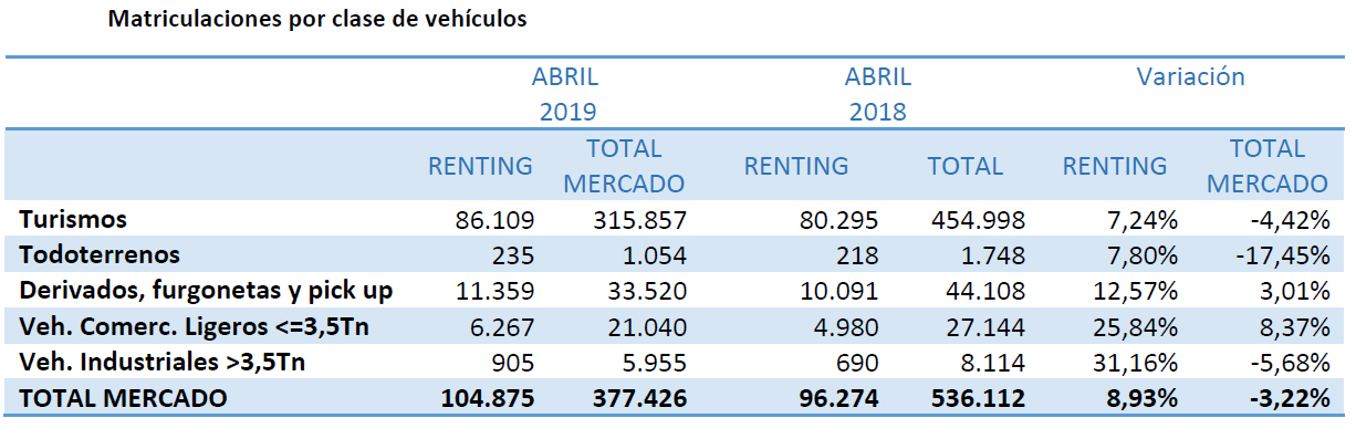 En los cuatro primeros meses del año, las matriculaciones de vehículos registradas por las compañías de renting se han elevado a 104.875 unidades, lo que supone un crecimiento del 8,93% sobre el mismo periodo de 2018, según ha publicado la Asociación Española de Renting de Vehículos (AER). En abril, el renting de vehículos ha contabilizado 30.022 matriculaciones, un 22,18% más que hace un año.