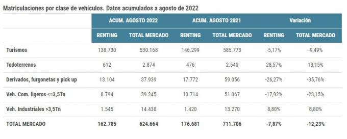 En cuanto a los resultados del mercado total en España, las matriculaciones se han reducido un 12,23% en los ocho primeros meses de 2022, hasta las 624.664 unidades. Por tanto, el peso del renting en el total de las matriculaciones ya es del 26,06%, cuando en agosto de 2021 era del 24,82%.