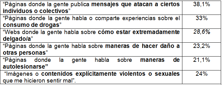 Esta visión positiva de las redes sociales e Internet no impide que perciban riesgos claros, el 70% cree que los riesgos de acoso en Internet y redes sociales son "bastante o muy frecuentes"; o que sean víctima de situaciones graves como el maltrato, que afirma haber sufrido el 34%. También los contenidos duros y potencialmente peligrosos a los que acceden en la Red suponen un riesgo claro. En porcentajes nada desdeñables, los jóvenes españoles señalan haber visto en el último año: