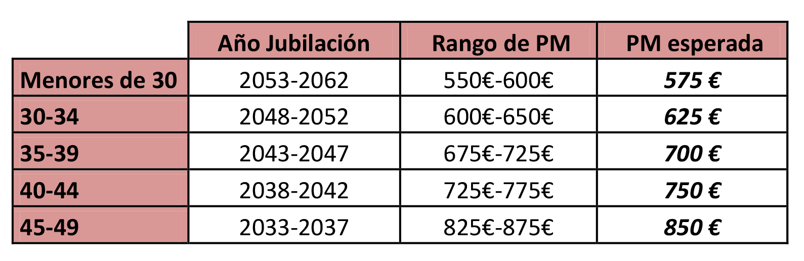 Los comprendidos entre los 40 y 44, por su parte, oscilarán entre los 725 y los 775 euros; y, por último, aquellos que actualmente tengan entre 45 y 49 años y que se jubilen entre 2033 y 2037, cobrarán una pensión media entre los 825 y los 875 euros.