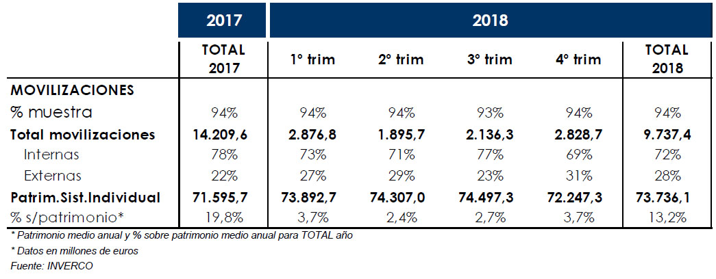 En 2018, las movilizaciones realizadas entre Planes de Pensiones Individuales alcanzaron los 9.737,4 millones de euros, lo que representa el 13,2% del patrimonio medio anual, según datos facilitados por Inverco que se ha basado en una muestra del 94% del patrimonio del Sistema Individual.