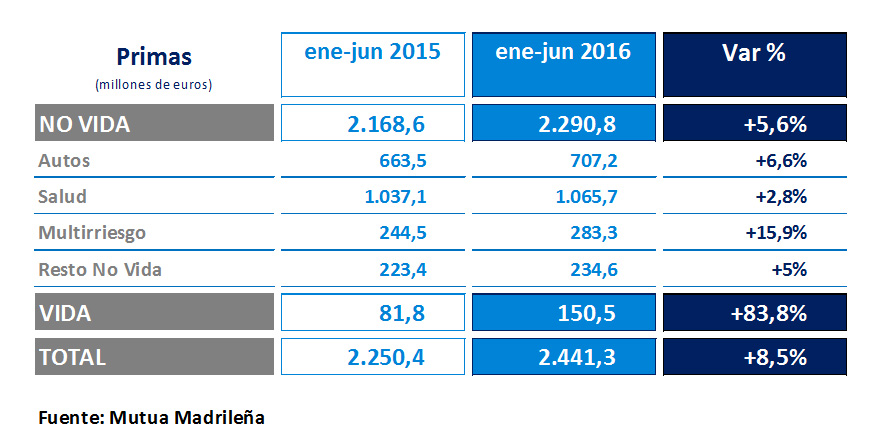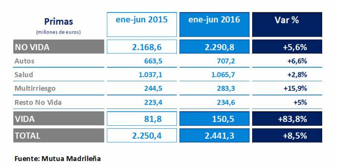 Otro dato significativo de los primeros 6 meses del año es que por primera vez la compañía supera los 11 millones de asegurados en este periodo, un 9% más que en junio de 2015. De estas pólizas, las de nueva producción se elevaron a 1,5 millones, un 6,8% más.