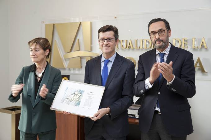 El premio, dotado con 3.000 euros, fue entregado por la presidenta del Consejo General de la Abogacía Española, Victoria Ortega Benito, y el presidente de la Mutualidad, Enrique Sanz Fernández-Lomana.