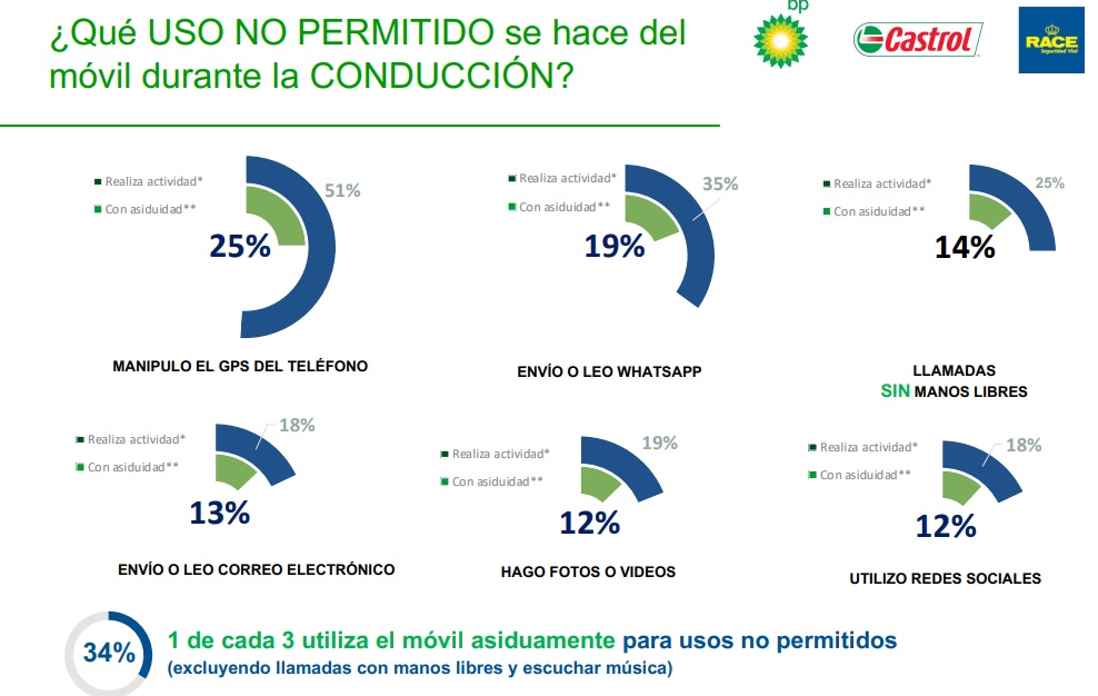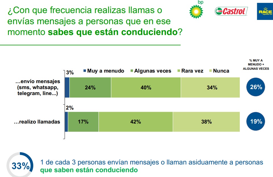 1 de cada 3 personas envían mensajes o llaman asiduamente a personas que saben están conduciendo poniendo en consecuencia en riesgo su vida. De hecho el 90% declara que es consciente que está poniendo en riesgo la vida del interlocutor. Esta es una de las conclusiones del estudio realizado por RACE, BP y Castrol 'VI Informe de distracciones'.