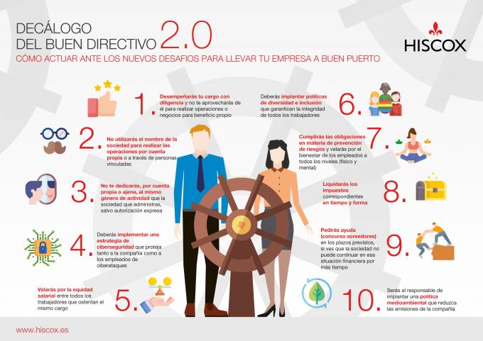 La nueva realidad que vivimos actualmente trae nuevas preocupaciones y nuevos retos para las empresas y, especialmente, para aquellos que las dirigen. Por ello, Hiscox, presenta el Decálogo para el Buen Directivo 2.0, para que los líderes de las empresas sean conscientes y estén preparados para hacer frente a estos grandes cambios, minimizando así los riesgos de sufrir una demanda por una gestión negligente en el ejercicio de su cargo.