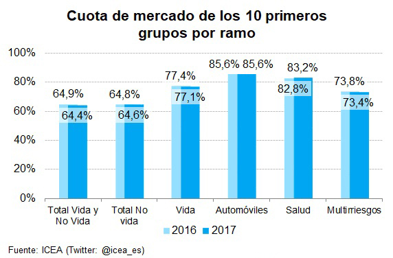 Según los datos de ICEA, considerando los 10 primeros grupos de cada ramo, el de menor concentración es el de Multirriesgos, con el 73,44% de las primas, mientras que en el otro extremo se sitúa Autos, donde los 10 primeros grupos suponen el 85,61% de las primas. Respecto a la evolución, Salud es el único ramo donde el nivel de concentración ha aumentado desde 2016, subiendo 0,4 puntos porcentuales.
