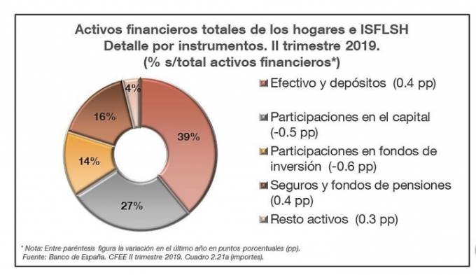 Los activos totales financieros de los hogares e ISFLSH alcanzaron en junio de 2019 un importe de 2,34 billones, un 3,5% superior al de un año antes. Este aumento fue el resultado de una adquisición neta de activos financieros de 45.000 millones de euros durante los últimos cuatro trimestres y de unas revalorizaciones netas de 35 mil millones de euros, debidas, fundamentalmente, al incremento del precio de los activos de renta variable.