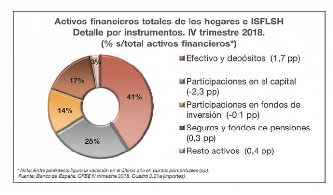 En relación con el PIB, los activos financieros totales de los hogares e ISFLSH representaron un 178,1% a finales del cuarto trimestre de 2018, lo que significa 9,3 puntos menos que un año antes.