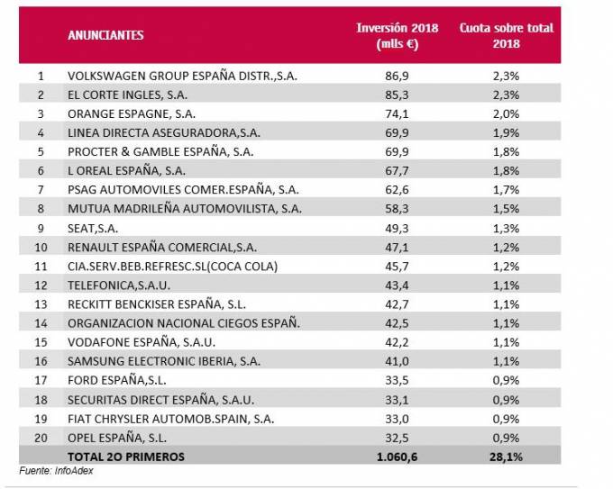 Línea Directa se encuentra en el cuarto puesto entre las empresas que más invirtieron en publicidad el pasado año en España. Concretamente, la entidad filial de Bankinter, se dejó 69,9 millones y la cantidad representa el 1,9% de la inversión total en publicidad. En el puesto octavo del estudio elaborado por InfoAdex se sitúa Mutua Madrileña que tuvo un gasto de 58,3 millones de euros que representan el 1,5% del total del pasado año.