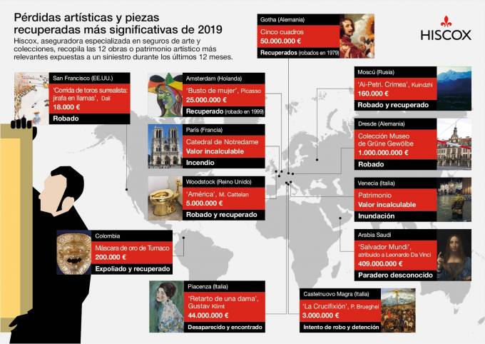 Eva Peribáñez, responsable del área de arte y clientes privados de Hiscox, ha comentado que "el objetivo de este trabajo ha sido poder mostrar de una manera sencilla algunas de las obras de arte y patrimonio artístico más notable que hemos perdido o han estado en peligro durante 2019. Espero que este proyecto sirva para que podamos reflexionar, ahora que finaliza el año, sobre la relevancia del arte en nuestra sociedad, y cómo debemos trabajar todos juntos en la protección de estas piezas únicas para que también puedan ser disfrutadas por las próximas generaciones". "La infografía nos muestra cómo nuestro patrimonio, ya sea de propiedad pública o privada, lamentablemente está expuesto a una serie de riesgos, independientemente de si están ubicados en grandes museos, galerías de arte o colecciones privadas. La buena noticia por otro lado es que aumenta el uso de seguros para este tipo de piezas, y que los delincuentes continúan enfrentándose al problema de introducir la obra robada en el mercado una vez ha sido sustraída, de ahí la recuperación de muchas de ellas aunque a veces lleve décadas conseguirlo", ha concluido Peribáñez.